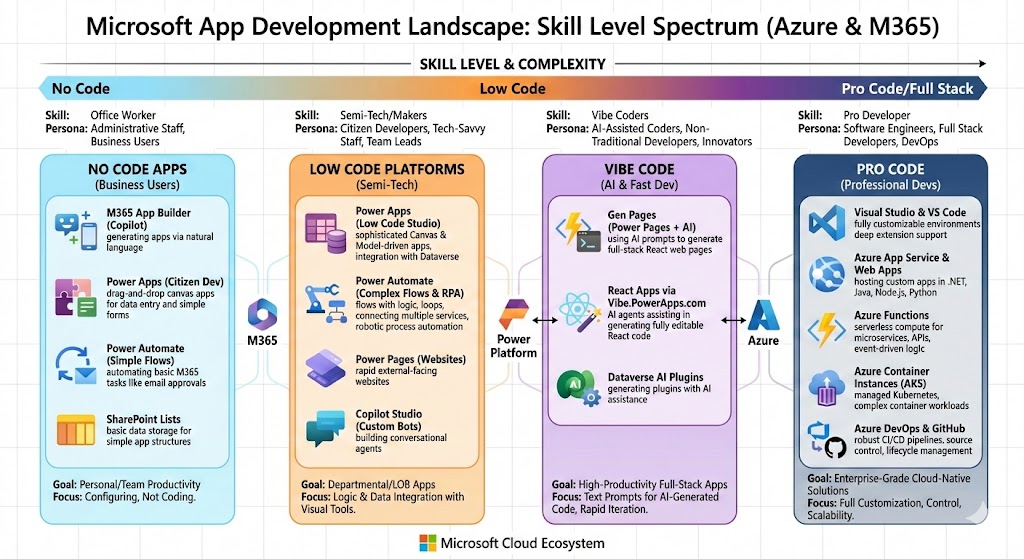 Organized by escalating complexity—No Code for absolute beginners, Low Code for those with minimal programming knowledge, Vibe Code for AI-assisted natural language development, and Pro Code for expert-level customization—Microsoft’s ecosystem ensures seamless progression and integration across levels.
