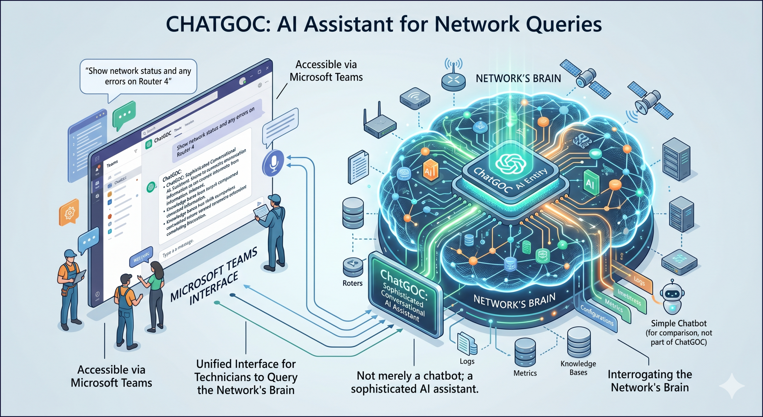 Accessible via Microsoft Teams, ChatGOC provides a unified interface for technicians to query the network’s “brain.” This eliminates the need for human-to-human gatekeeping by putting four critical data streams directly into the technician’s hands: